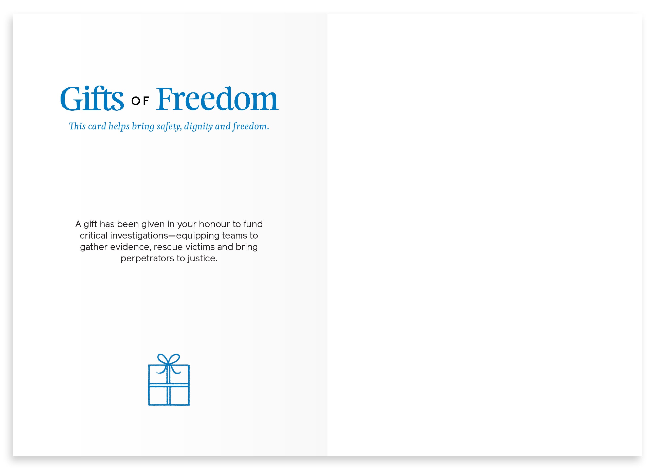 However, digital cards are available worldwide, so anyone, anywhere can give the gift of freedom.