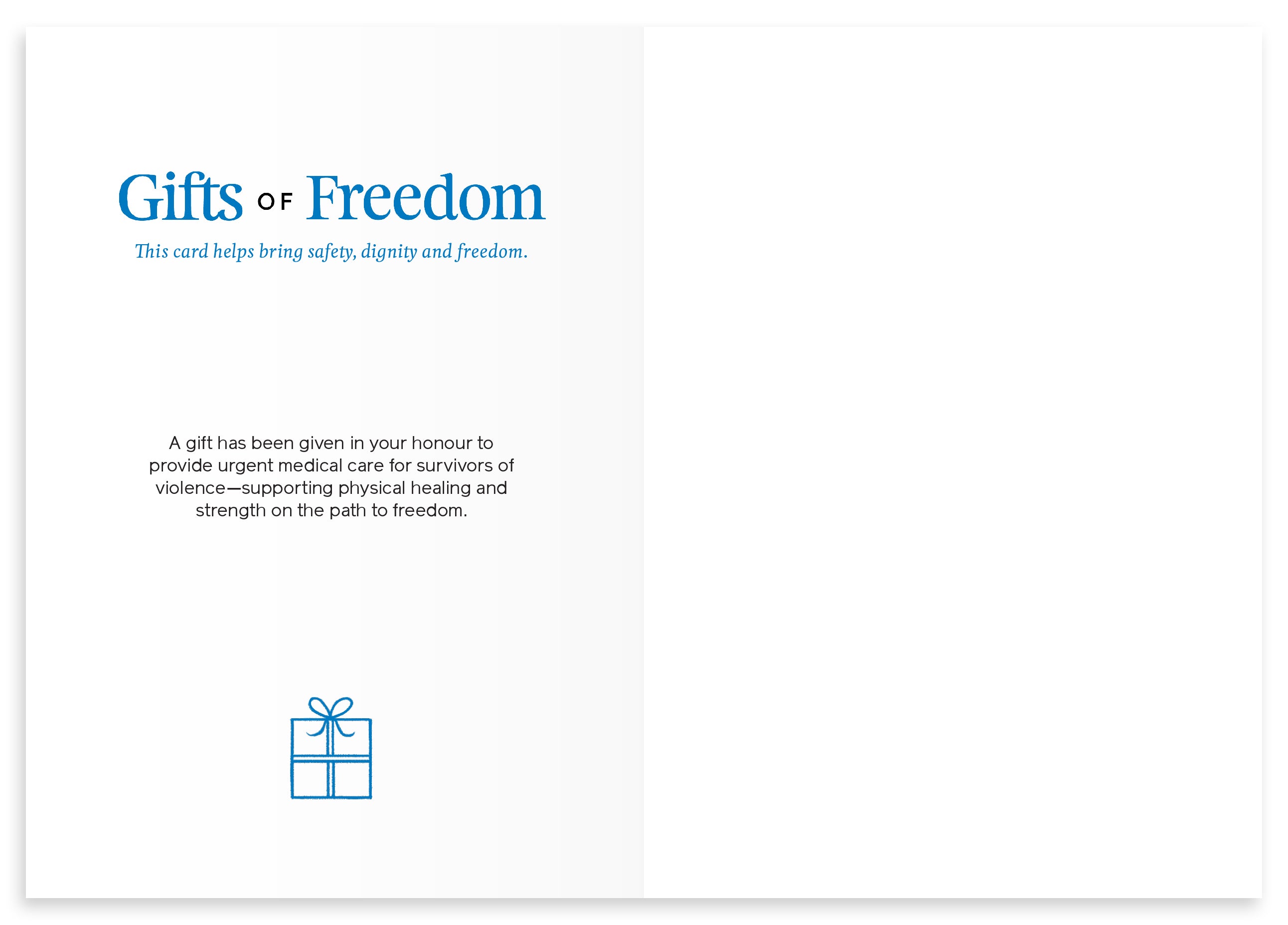 However, digital cards are available worldwide, so anyone, anywhere can give the gift of freedom.